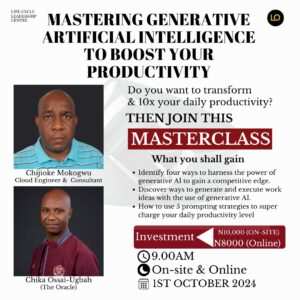 Then Join Chijioke Mokogwu and I for an immersive masterclass: “From Idea to Execution – Mastering Generative Artificial Intelligence to Boost Your Productivity.”